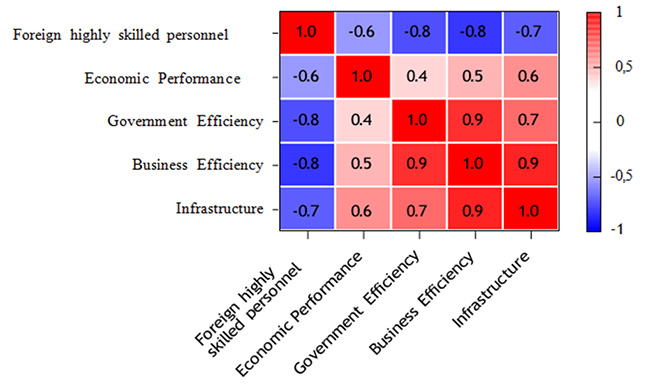 La corrélation la plus marquée apparaît entre l’indicateur « personnel hautement qualifié étranger » et les indices « efficacité des entreprises » et « efficacité gouvernementale ». Cela suggère que l’afflux de capital humain de qualité est directement associé à des améliorations de l’efficacité de l’environnement des affaires, de la performance managériale et de la capacité institutionnelle de l’État. Dans les pays où la concentration d’immigrants qualifiés est plus élevée, l’environnement des affaires présente une plus grande flexibilité organisationnelle, une adoption plus rapide des technologies numériques et un degré plus élevé d’ouverture à la coopération transnationale.