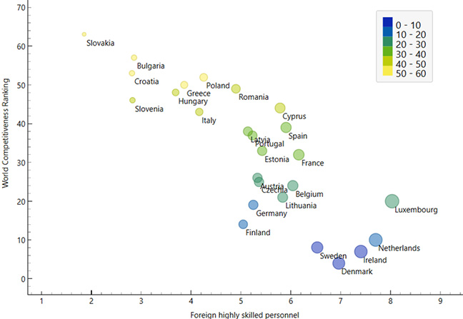 La comparaison de ces deux indicateurs permet d’observer comment l’attraction des talents étrangers influence la position des pays sur la carte mondiale de la compétitivité, ainsi que d’identifier les différences internes entre les vingt-sept États membres dans la « course aux talents ».
